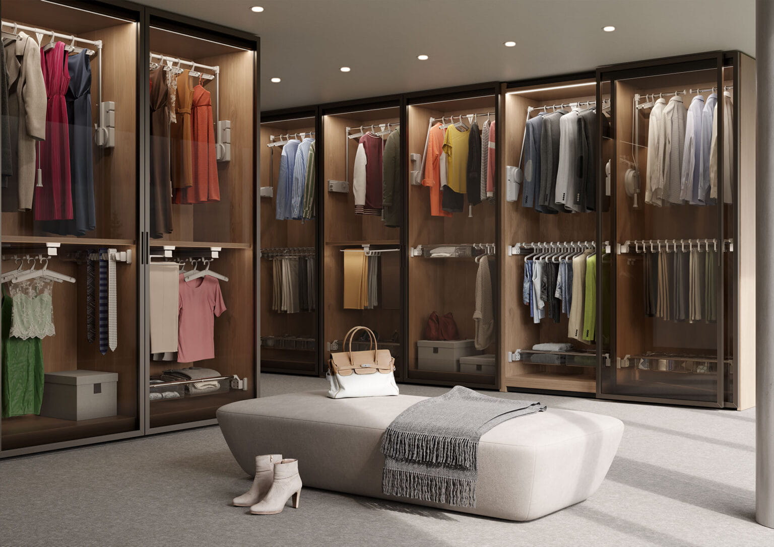 Montaż jest niezwykle prosty: w całości opiera się na standardowym systemie wierceń „System 32”, co eliminuje konieczność wykonywania dodatkowych otworów w ściankach szafy. Dzięki opcjonalnym wspornikom z blachy, system można zamontować również bezpośrednio na ścianie lub wewnątrz otwartych garderób.